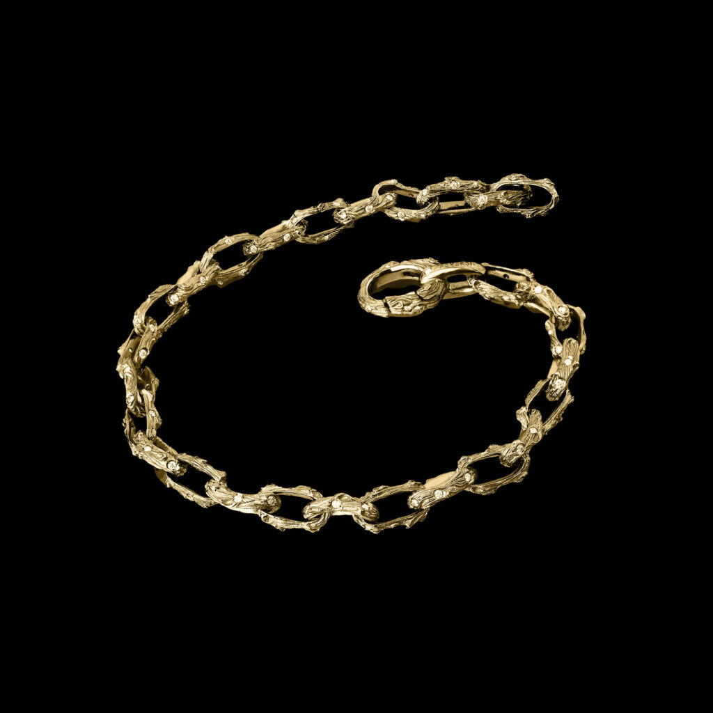 The Tree of Life choker is a necklace made of chain. Each link of the chain is made of 18KT gold and natural diamonds, worked with the vine shoot design.