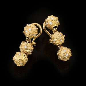 Seed of Life earrings feature three 18KT gold spheres and natural diamonds worked with the Tree of Life design.