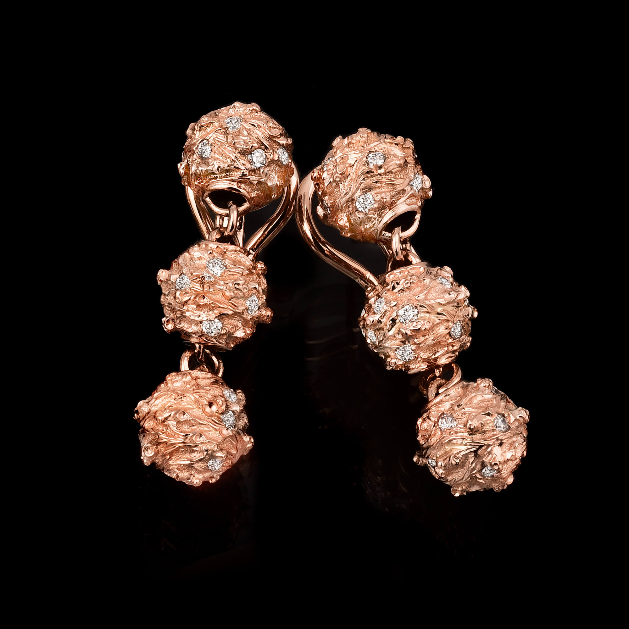Seed of Life earrings feature three 18KT gold spheres and natural diamonds worked with the Tree of Life design.
