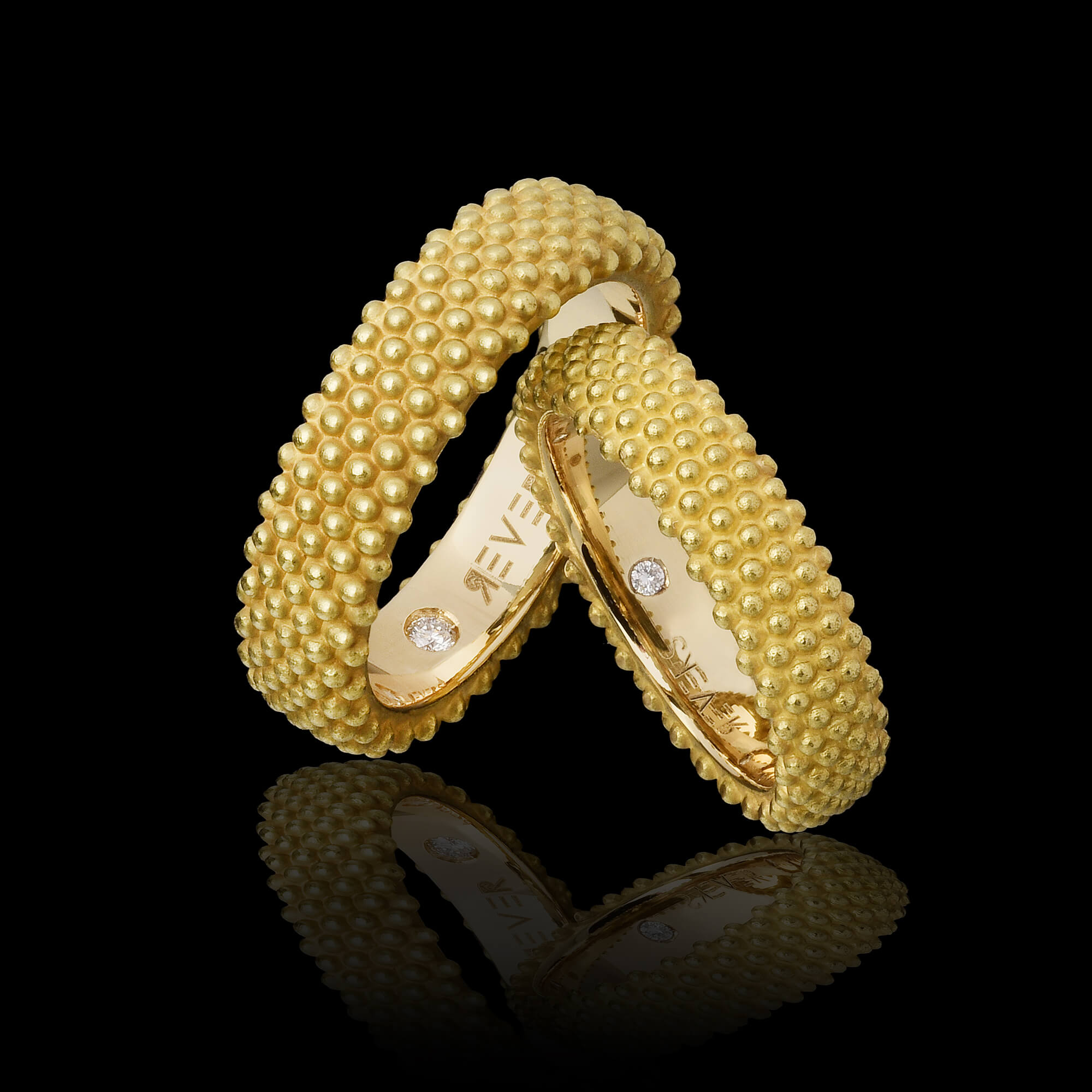 L'Anello Etrus è ispirato all'antica granulazione etrusca in oro 18KT, e da un diamante naturale incastonato all'interno.