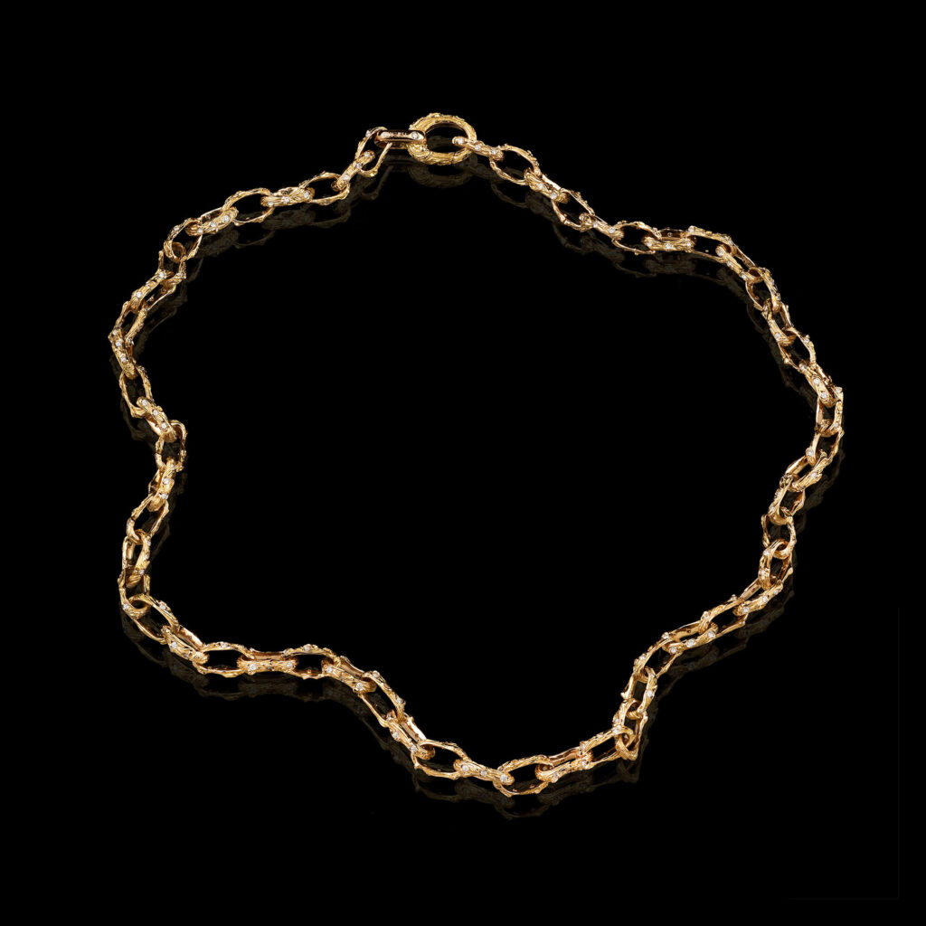 Il bracciale Tree of life è un bracciale morbido fatto a catana. Ogni anello della catena è realizzato in oro 18KT e diamanti naturali, lavorato con il design tralcio di vite.